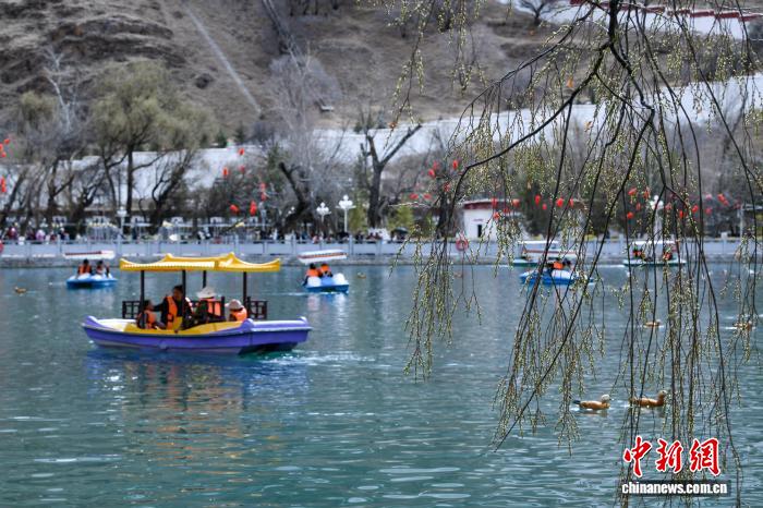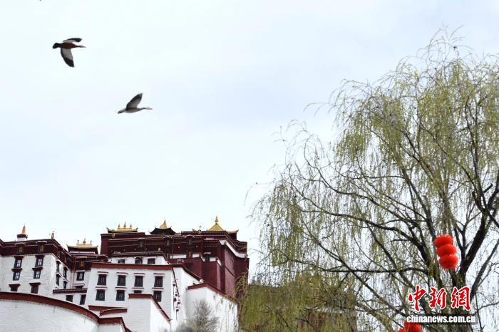 3月8日,西躲推萨宗角禄康花园,杨柳萌芽。阳秋3月,古乡推萨桃花始搁、生气盎然,秋意渐浓。中新社记者 贡嘎去紧 摄